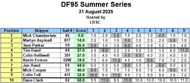 Wow what a great day of racing, breeze , a really nice firm top suit day, it started breezy and gradually got stronger, with one or two tasty moments in the last couple of races, Tim was there bright and early and had already sorted the course out on the East Bank ( Most’s favourite) with the prevailing wind. we had 10 skipper’s out, and really we all went home with a broad smile. Micky boy took the first bullet, and Martyn the second, The breeze even though good was still quite fluky and you needed to be on your toes to take advantage, going beyond the lay line was not a great idea, and on occasions a starboard hand lift near the bank definitely paid dividends. Martyn took the third , while Tim was not quite on it as he usually is, however he picked up a couple of seconds in race 3 & 4 , Sam P was strong putting together some nice average scores as was Colin H and of course these guys along with Martyn were keeping their eyes on each other re the final cumulative. Kevin was a bit up and down, and like most of us is seaching for that magic word that escapes my lips at the moment, My eye was noticed looking toward young Colin T , dont know why but his sailing was definitely on the up and he appeared to be sailing much better in fact he got a third in race 8, well done. Jen was steady as always, and Dave C or Clarky as he like to be called is steadily improving, but enjoying himself, It was quite a fierce battle at the sharp end, and with 9 races completed Micky boy , “yes I know he is getting on a bit ” , but he took five wins, and his green machine look pretty quick on the day, so very well done to him. I must say the lake looks in superb condition, and is a credit to the club, final thanks to Tim for getting the stuff out and of course for putting it all away,