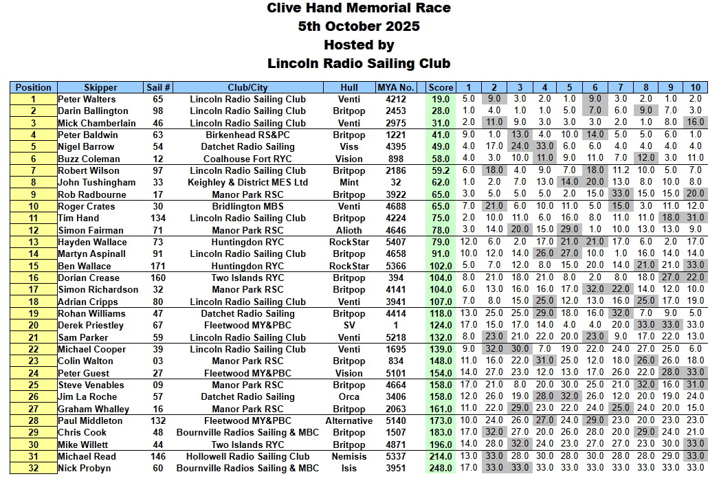 So to the results. We have a winner and many congratulations must go to Peter Walters who took the top step, 2nd place going to Darin Ballington, and 3rd Micky boy Chamberlain. Many thanks to the Race team who worked wonders as always, and of course to all the skippers who sailed their best, and finally to storm Amy who gave us the very best conditions for some superb racing.