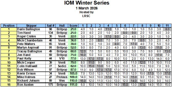 By race 5 Darin had got his act together with five straight wins, Tim H was going well , but probably not as well as he knows he can, but interestingly the, the top two Darin and Tim, are the Lincoln clubs skippers who have qualified for the forthcoming worlds that will be held in May way down south in Datchet water, and they were only split on countback ,, third spot went to Roger ,only one point adrift. I have got to say that this club racing at Lincoln is second to none and certainly the place to be for competitive I.O.M racing, everybody I am sure went home with a smile on their face, just one thing to add thanks to all for helping put the gear away, and we hope to see you all in two weeks time for our extended day Pop up event .