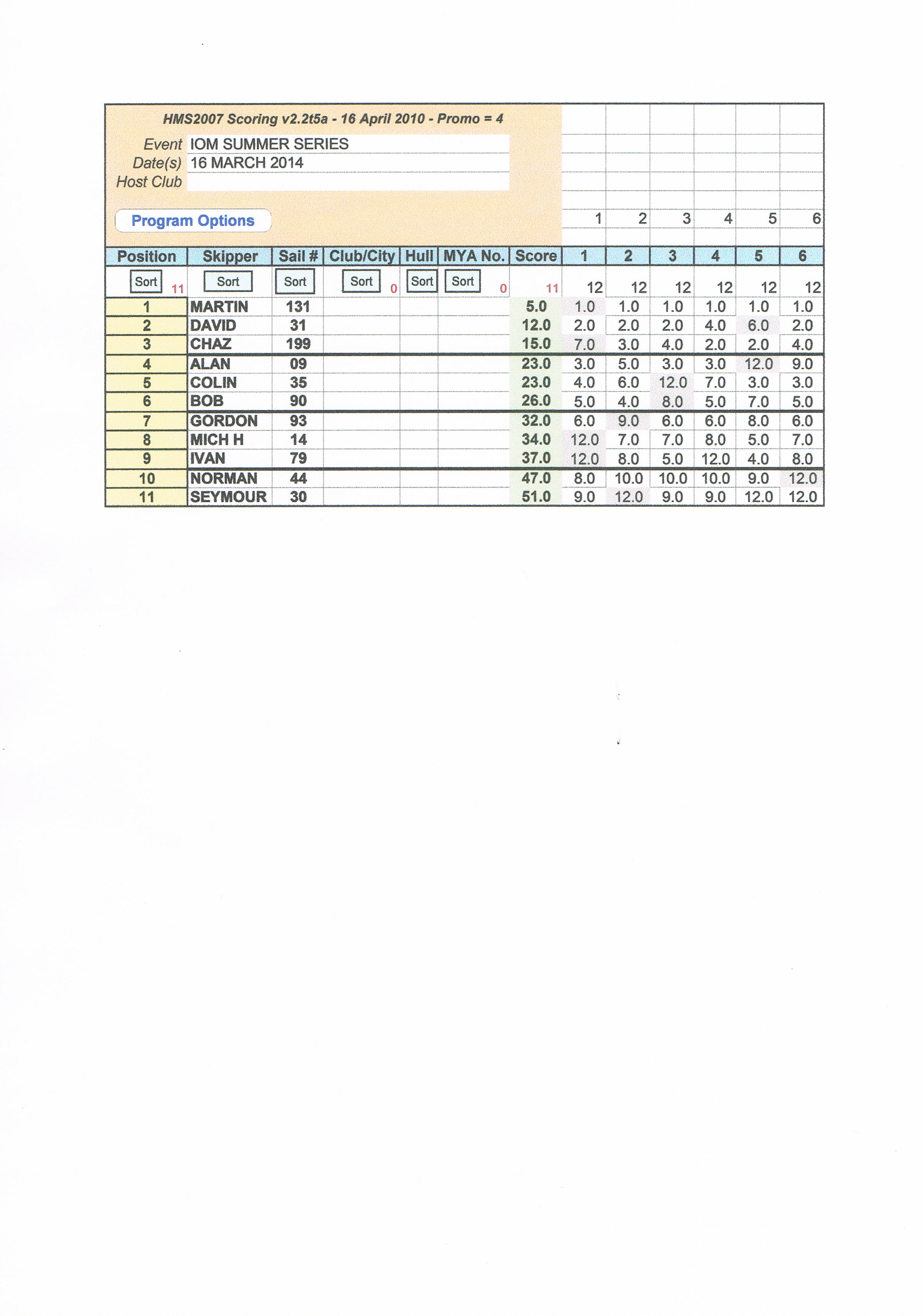 Despite being promised a nice steady south east wind it was fitful and variable from the north. 5 RMs and 5 IOMs took part in the main racing with a further 9 RG/DF for 3 fun races at the end. Unfortunately the wind slowly reduced in strength to the extent that there was not enough to get the third race as far as the start line.