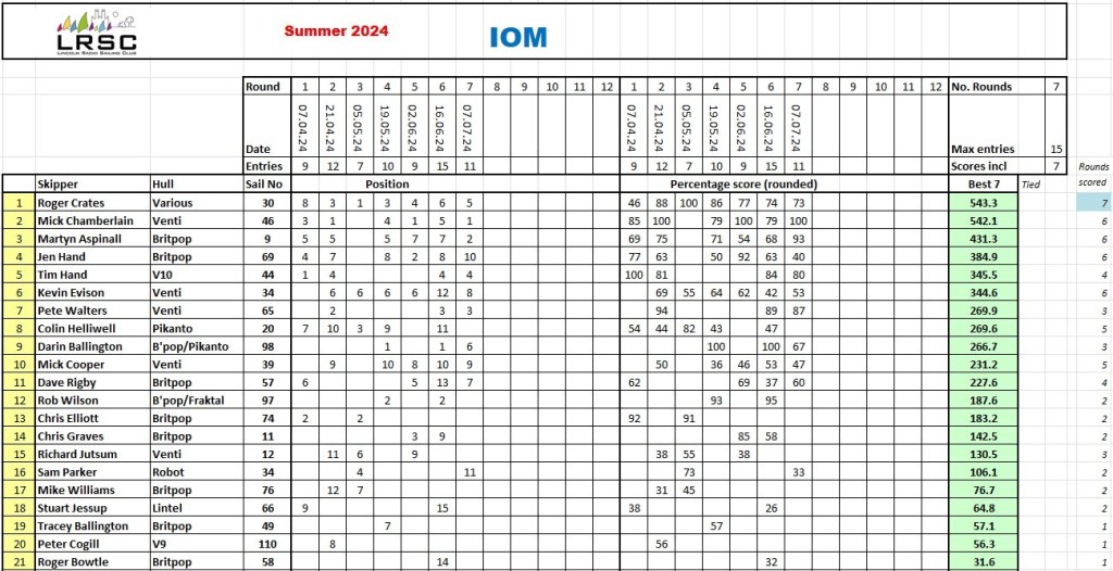Forecast was probably not the most appetising, and may have influenced the turnout, Ten skippers,, and Darin the OOD was at the lake early setting out the course and getting it organised and it was only just gone 8 am, several skippers were there early, and all were going to be rewarded with some great racing in almost perfect conditions. The breeze 60/70 % of top rig sometimes less, and sometimes more ,and straight down the East bank, was to give us some great races in a very competitive fleet, As usual and fast out of the blocks with his Brit Pop was Darin B 98 taking the first win from Roger C 30 in second and Mick C 46 in third, 5 different designs were on show, including the very quick design of Roger C 30 who continues to impress. Almost three full beats and two long runs, gave everybody a chance to get back, if they fell behind, the racing was close right through the fleet, Race two was Mick C 46 who seemed quite pleased with the way the Venti was going after a change in the settings to various aspects of the boat, he was followed home by Tim H 44 with his V10 , and third spot was Roger C 30 keeping a good ave going, A different winner for race three Pete W 65 , with Roger getting a 2nd , Tim taking 3rd ,,, Mick C 46 was in a great position in race three but was adjudged to have not finished correctly and had to retire , no points there then !!!!. Next race race 4 there was a tie up of three boats on the start line ( the two Micks and Darin ) and again Pete W 65 took full advantage to take the win , Tim H 44 in second and Martyn A 91 coming through to get 3rd, Coffee break came and went and still we had had no rain just beautiful sunshine, Not quite sure why but Darin B 98 was not having it all his own way, which is a very rare occurrence, Pete W also was not on top form despite winning three of the races. This was racing at its best , well it was for some, and at the end it would have been to tight to call out the winner, But Mick C ‘s Venti did appear to be going very well and so it turned out, He took the win on the day by a clear margin, Martyn A 91 finally getting to grips with his Brit Pop and taking second spot , with Pete W 65 on the podium , there will be one or two a little disappointed with the result, But I am afraid the grin was wall to wall on Micky Boys face when he saw the results , carefully worked out by Colin Helliwell who fastidiously does the results for us each week, Next weekend poss 8 Lincoln skippers will make the trek up to Fleetwood for the I.O.M ranking race, and with 60 skippers entered , and many champions of differing classes this will be a great event.