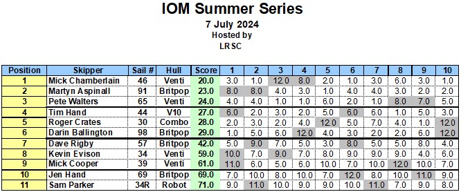 Another great day at Lincoln all prelims done by the two Rogers before the OOD arrived at 0830 so all that was needed was to move a few buoys, and with the breeze coming down the East bank around 8 knots the eleven skippers were good to go, Roger B very kindly did the line and finishing duties. A good windward leeward course was sorted which gave the fleet three good beats so fantastic if you wanted to get some steps in. Race one was a close affaire with Mick C 46 just pipping Darin B 98 and Roger C 30 with yet another I.O.M he was trying out took third spot. The racing was close all thru the fleet with 5 different designs on show, for some reason we seemed a little short on Skippers but I guess with Holidays and Bungy jumping going on it was to be expected, for those who missed it , you will not get many better days. Roger took race two and Darin took race three, The race course appeared to be free of any obstructions (if you know what I mean) although I did hear the odd murmur, For me Mick C 46 i had not problems , and the boat seemed to be well suited and set up for the conditions, and in my eyes it seemed to be very fast, last race before coffee Mick C 46 took the second win of the morning very closely followed by Darin, and Jen H 69 taking third spot, In race three Tracy grabbed a second place making it a One /Two for the Ballington family who enjoy there racing immensely, as I am told it is a three hour round trip for them. Coffee over and skippers called to the start line , and with the breeze increasing very slightly 1 to 2 knots, it was great racing around the middle of the fleet with Jen and Martyn going at it hammer and tongs and Stuart J 66 doing a lot better , Richard J 12 was just not able to sort out the yellow Venti despite The attentions of Darin to try to get the best from the rig, and had a disappointing morning. Kevin E with another Venti who will be a bit disappointed, just could not find the sweet spot, and ended the day loosing his lanyard clip with the result his tranny ended up in the drink, and missed the last two races. Dave B 57 who I hear is after another boat , (justa rumour) had one or two good races but knows he could do better, but managed to split the Hand / Aspinall partnership.