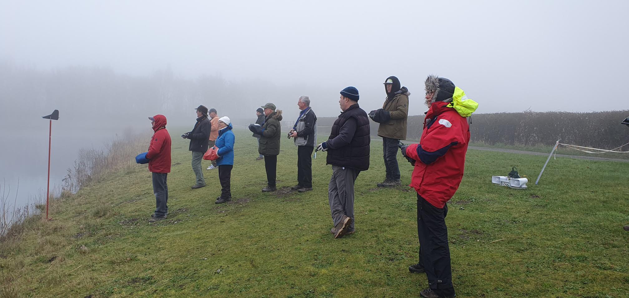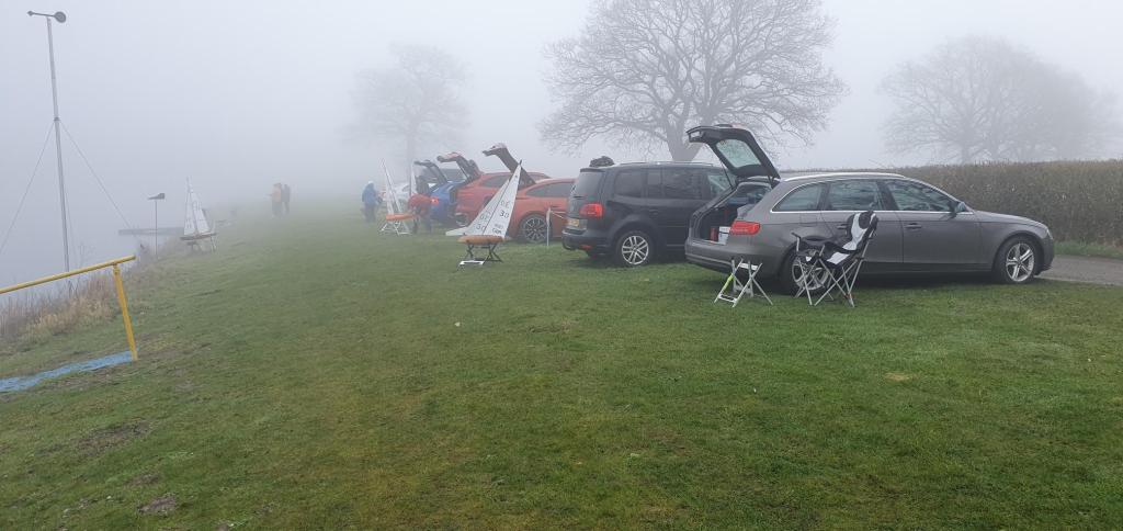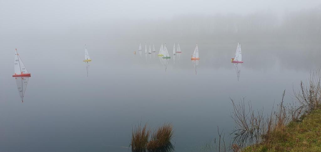 A Misty mirky day dawned with not a breath of wind at Lincoln, Race officers with help went out looking for some buoys, from different parts of the lake and as Darin emerged from the mist a shout went up ” hang on is this an illegal in a small boat” and it was only when he was fifty foot away we realised it was Darin with a boat full of Boys ,, sorry Buoys, many thanks Darin for all your help Mate