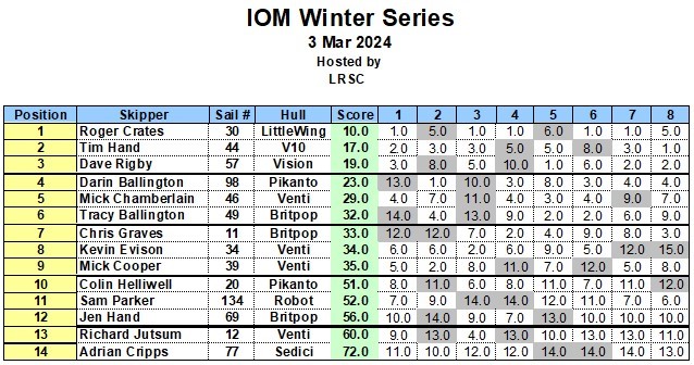 Well done to everybody who helped out especially to Roger Bowtle who gave up his racing to do a Stirling job as race officer, apart from the rain, the sailing conditions were perfect and gave us some great races, we now look forward to the Summer series that will start in April and before that the DF TT that is being held at the club on the 23rd and 24th March ,,, just two weeks time and we shall see the best skippers in the UK descend on Lincoln.