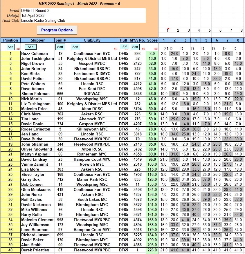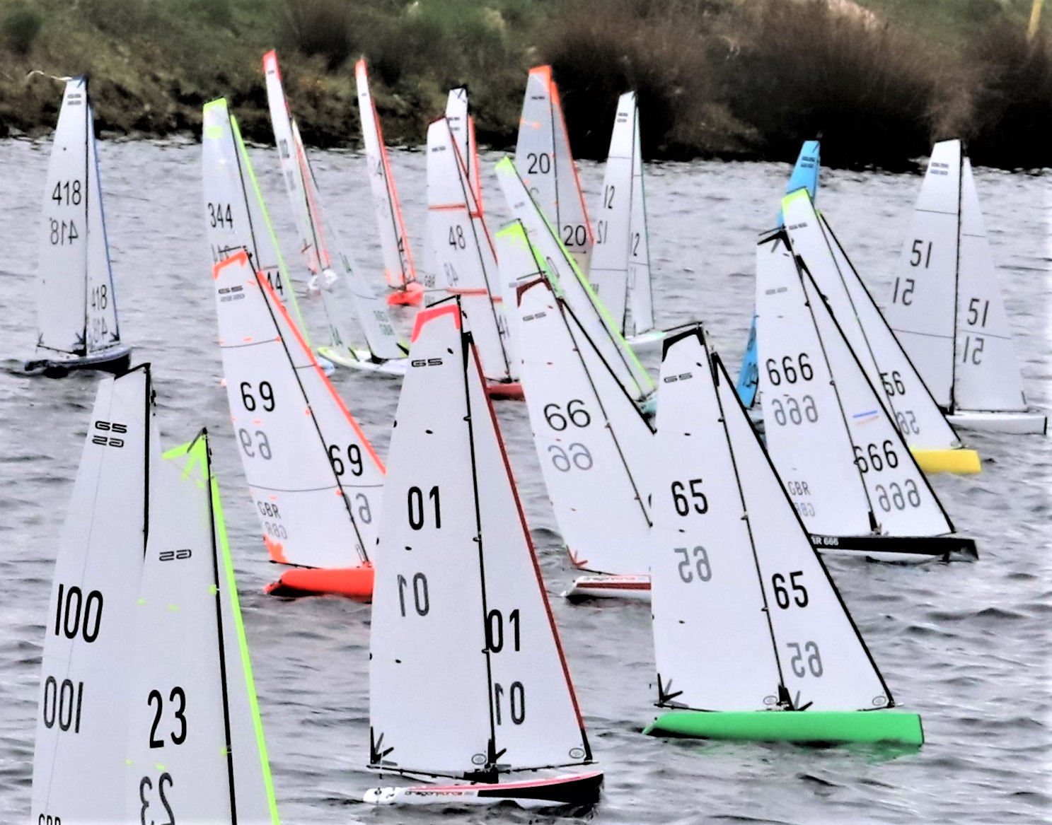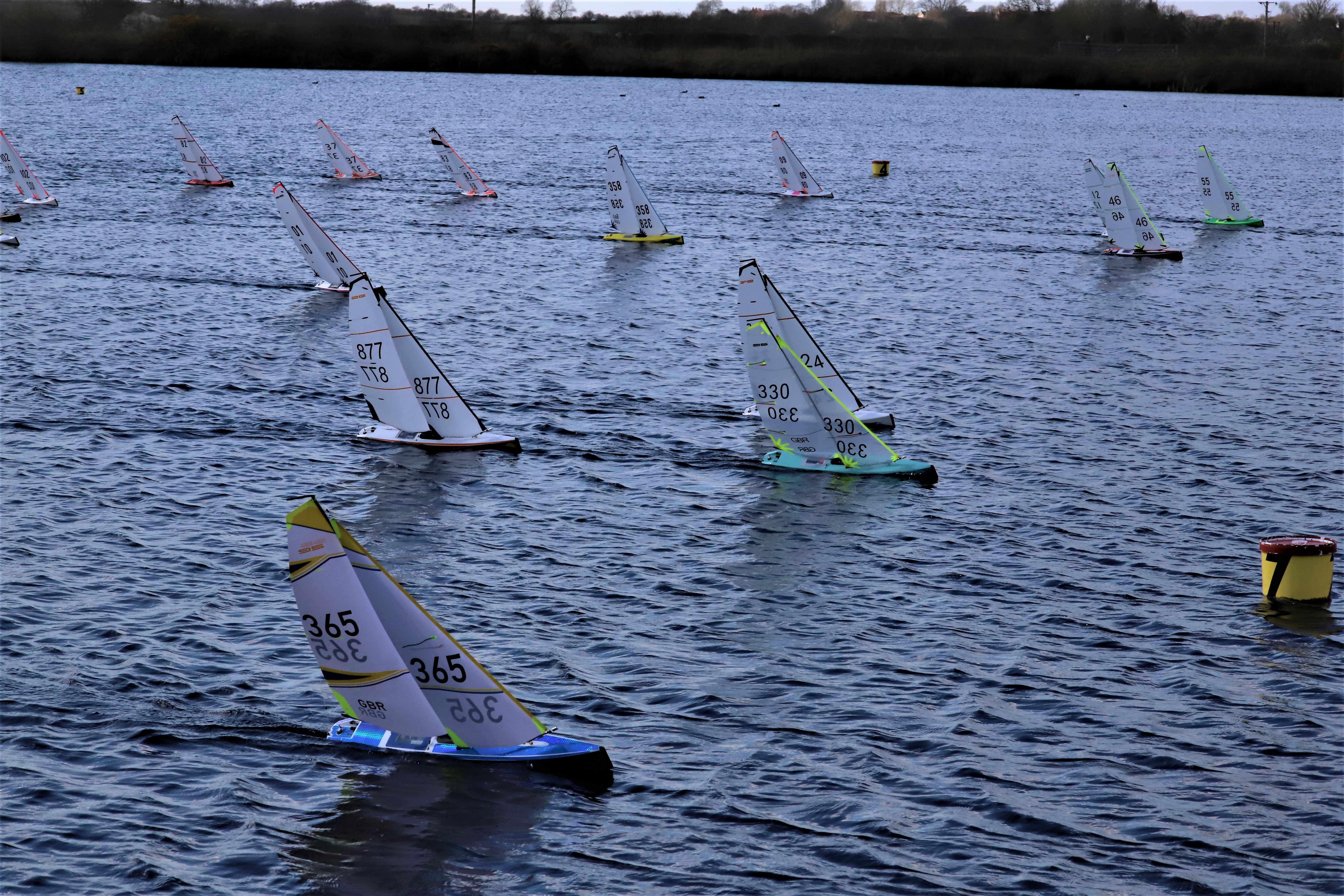 April 2023 and the DF fleet comes to Scotland Farm , Thorpe on the Hill. First up the DF 65 , 40 skippers from around the country descend on our lake to give some great racing, the wind direction was not the best and ranged from 6 knots to around 10 knots. It was a chilly day with the breeze strait out of the North. Buzz Coleman, from Coalhouse Fort in Essex won the day with an impressive 4 wins from 8 race’s held in two fleets, John Tushingham from the Keighley up on the Yorkshire moors was second and Nigel Brown from the Gosport club , way down South was third Three local skipper’s took part, in this first day of racing , and the club can be commended for their organising ability, Bacon butties , and soup and bread to warm up the coldest hands ,