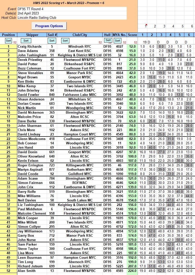 But I must move on , early Sunday morning and the breeze was lighter , but hey ho it had veered a tad and was now out of the North East , Straight down the lakes East bank, and dare I say it almost perfect conditions. Today we had 52 skippers and so it was necessary, to have 3 fleets . Starting with the Seeding race’s that were won by Craig Richards and David Adam from down South and John Sharman from the North west end of the country, we then had a short break and then some right royal action. The Start line was ( as an observer ) perfect , Skippers will not agree, I am sure , and so we had one or two general recalls, and the first 2 thirds of the beat was just about normal but the last 50/70 yards to the weather mark were a test of everyone’s ability, and it was never the same for each race, At the end of the day the skippers who handled it best were at the top of the leader board, Graig Richards, took the win , closely followed by Dave Adam and John Tushingham . But I have to say very well done to all competitors over the two days of racing, The home club Lincoln had 6 skippers racing on the Sunday so very well done to them, I would also like to say many thanks to the Lincoln club, for putting on the event and all the helpers over the last two days who contributed to a great event, on and off the water.