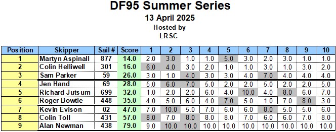 Fourteen races were completed in a friendly manner with great honesty and sportsmanship being demonstrated. Pete sailed with consistency and recovered top form to take the final three races (with Martyn usually snapping at his heels) and to take the day which cemented his pole position on the series leader board.