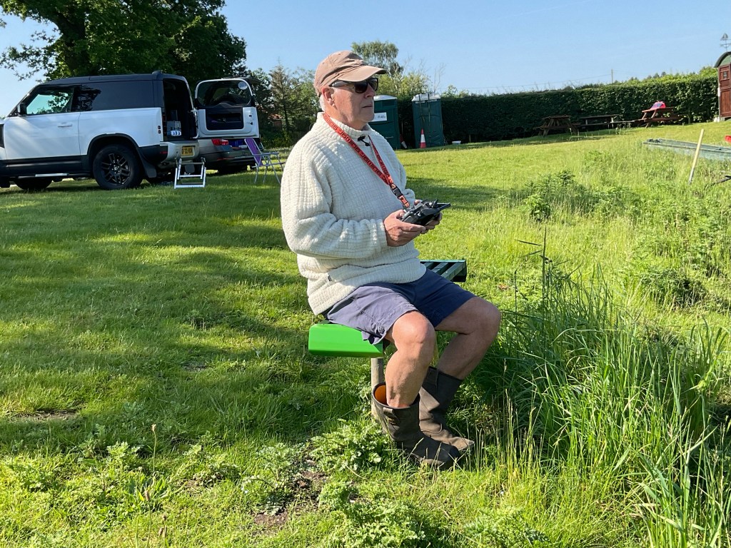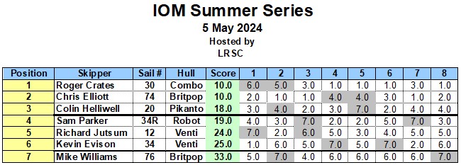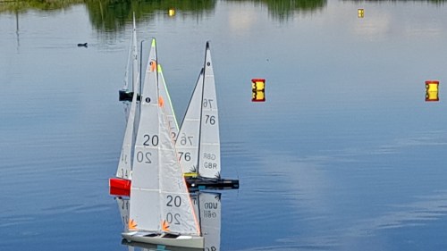 It was decided that this was a good time to take a break and wait for the wind to steady and hopefully stay in one direction but to no avail so back to the south bank we go for race four where Roger Crates managed to get the first of his race wins and Sam Parker bringing his Robot home in second place, racing for the rest of the day was to be on the south bank with the wind going around in circles and rising and falling, races five, six and were taken by Roger Crates with his home built Combo showing good pace after a slow start to the day. Race seven was to be interesting as the wind had veered around to give us a running start but thanks to everybody showing restraint no one was over the line with Chris Elliot taking the win, it was by now 12.50 and Mike Williams asked the fleet if they wanted one more race and with a resounding yes race eight was got underway with Roger Crates again showing his boats light weather performance taking the last win of the day. So with eight races sailed this gave us two discards and Roger Crates the overall win on the day with Chris Elliott taking second place overall on countback and Colin Helliwell taking third place just one point less than Sam Parker. At the end of the day all of the competitors helped the race team yet again by pitching in to put away all of the equipment and all were thanked for making the days sailing fun as well as competitive.
