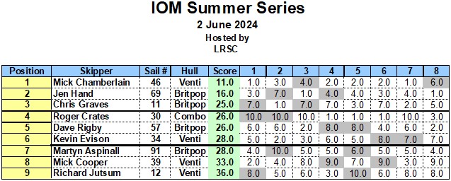 Racing commenced in light airs which periodically declined to nothing at all. Mick Chamberlain dealt best with the conditions, gaining a win, followed by Mick Cooper, then Jen.