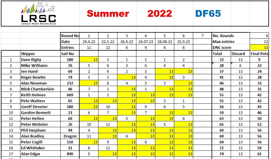 And we have a winner ,Dave Rigby picks up another trophy , so very well done to him, Mike Williams came home in second place and Jen Hand in third. A great series that had 17 skippers taking part at one time or another. With only one discard available to skippers, it may have had an adverse effect . we shall give the scoring side of things for all three fleets a bit of an overhaul for the upcoming winter series, In line with some comments made, It may well be that instead of discards in say a series of 6 races we may say it is your best four to count in the series. more of that in the news in the weeks to come .