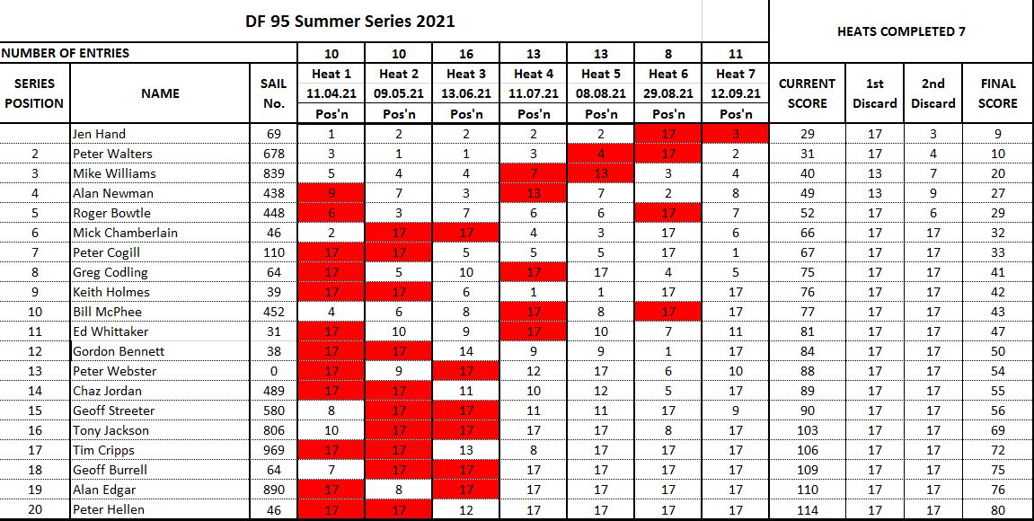 HEY IT LOOKS LIKE WE HAVE A WINNER . Very well done to little miss dynamite Jen Hand for winning the Df 95 Summer Series at Lincoln. After 7 hard fought rounds she beats Pete Walters by one point, and some great sailing by Mike Williams who raced home third, a big congratulations to all the competitors, 20 of you from the club it has been a fantastic season of racing at the club, and I hope that you will all support the Winter series that will start on the 17th October 2021.