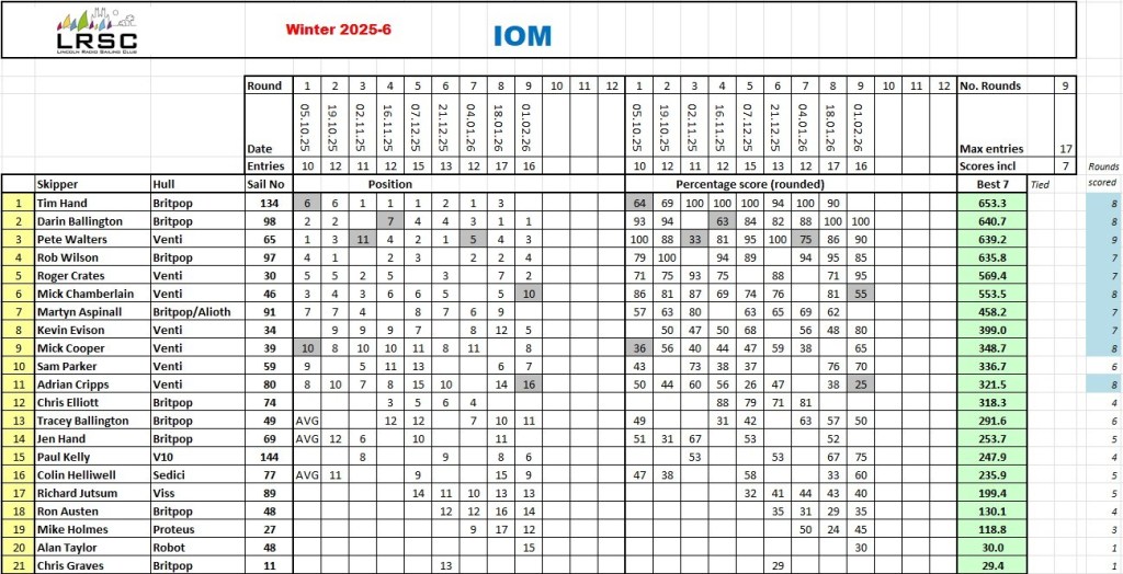 Now up to round 9 even though round ten has been completed , we have an almost clear winner with Tim but Darin told me he will never give up, Pete’s hoping they both go and sail elsewhere for a bit ( just joking ) it is very hot racing at Lincoln and attracts some great radio racers, round ten will be updated asap just be patient , whoever wins this series will have deserved it