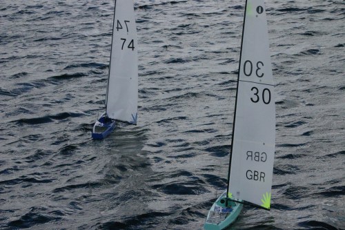 12 skippers were greeted by a great “WsW breeze 12 to 14 knots , warm and racing started on the South Bank. Keith Holmes was quick of the mark with two bullits with his old I.O.M the ” Cheinz”. The Lake after the big cut on Wednesday and the strong south westerly was free of weed and some very processional races, Things improved after the coffee break when racing was moved to the East bank and a decent beat long beat made racing much better and the breeze at times was 90% of top rig, and gave for some very interesting races. The Sedici GBR 46 found the sweet spot and apart from a couple of premature starts had a consistant morning in preperation for the upcoming ranking next weekend, in darkest Southport.
