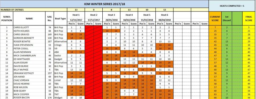 Great turnout for heat 6 , 13 skippers and could have been more. Chris Elliott wins by a good margin so congratulations to him , you will see a one or two ties after discards and you will also see the rules for breaking them below the results, these rules apply for all series winter and summer.