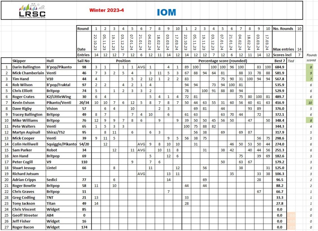 Final round 10 and we have a winner Congratulations to Darin Ballington who attended 8 of the ten races a great example to us all , only one skipper Kevin Everson attended all ten races, Only two occasions we dropped below double figures for the series , we have the members so let us try and support the upcoming summer series. and have some fun into the bargain.